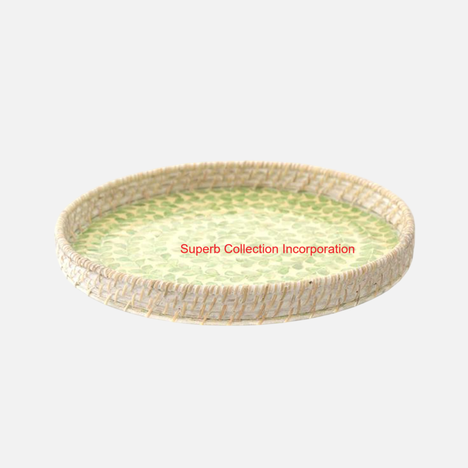 Bandeja de servicio redonda de ratán Natural hecha a mano con bandeja Premium de nácar para decoración del hogar, bandeja ecológica de cocina