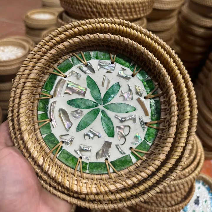Bandeja Artesanal de Ratán Natural con Incrustaciones de Conchas en el Centro para Servir y Decorar, Vietnam