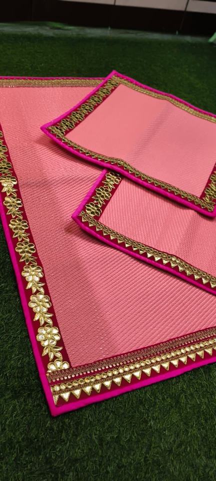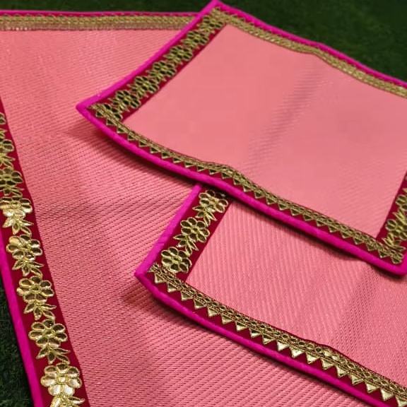 Juego de Manteles Decorativos Rosados Hechos a Mano con Elegante Borde de Encaje Dorado, Camino de Mesa Festivo y Manteles Coordinados para Pooja