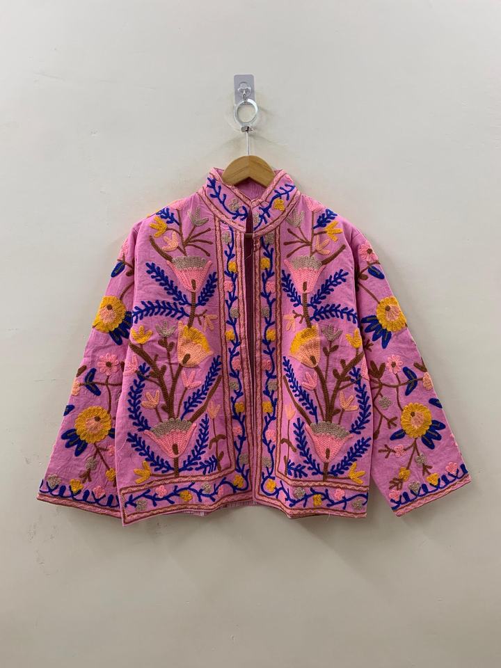 Chaqueta Bordada Floral Rosa Hecha a Mano para Mujer, Estilo Boho Chic, Abrigo con Bordados Vibrantes, Chaqueta Étnica Ligera
