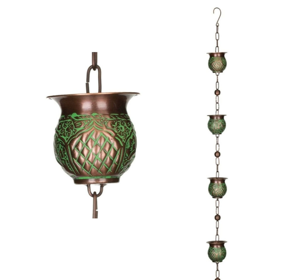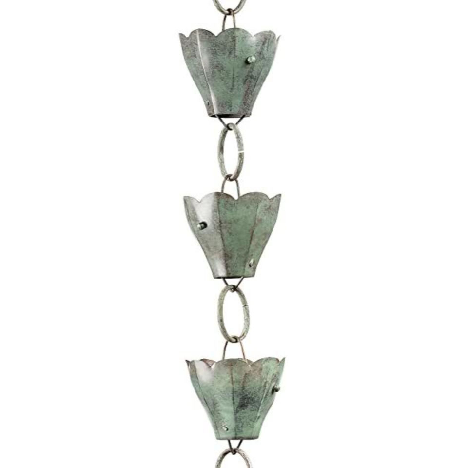 Cadena de Lluvia de Cobre Puro Hecha a Mano con Diseño de Tulipán, 8.5 pies, Acabado Patina Verde Azulado, Reemplazo de Bajante de Canalón, Decoración de Jardín