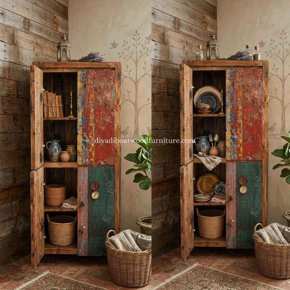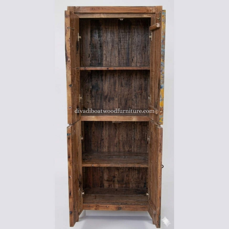 Armario de teca reciclada hecho a mano con estantes interiores, diseño minimalista único, madera maciza alta de 4 pies, almacenamiento multifuncional para comedor, hogar y bar.