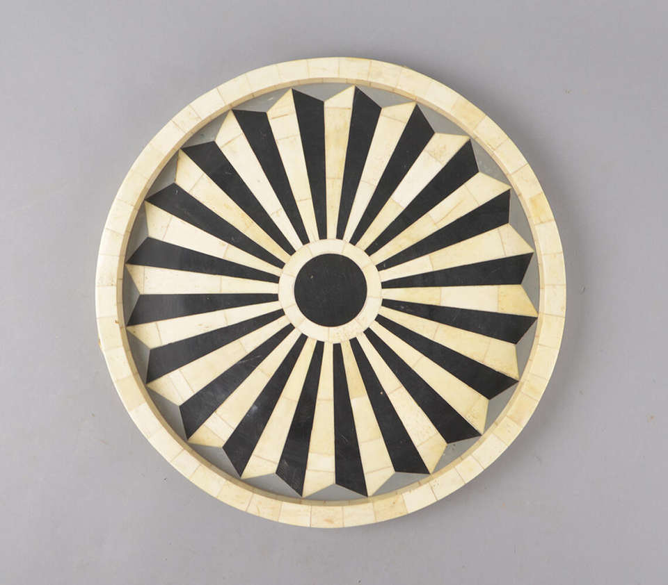 Bandeja Decorativa Redonda Hecha a Mano con Incrustaciones de Hueso en Blanco y Negro con Patrón de Rayos de Sol para Mesa de Centro, Otomana o como Detalle