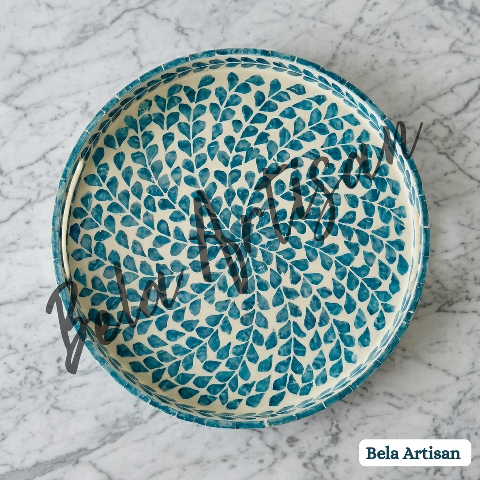 Bandeja y Plato Decorativo de Madera Hecho a Mano con Incrustaciones de Hueso Redondas y Patrón en Espiral de Pétalos Azul Turquesa para Ramadán y Bodas