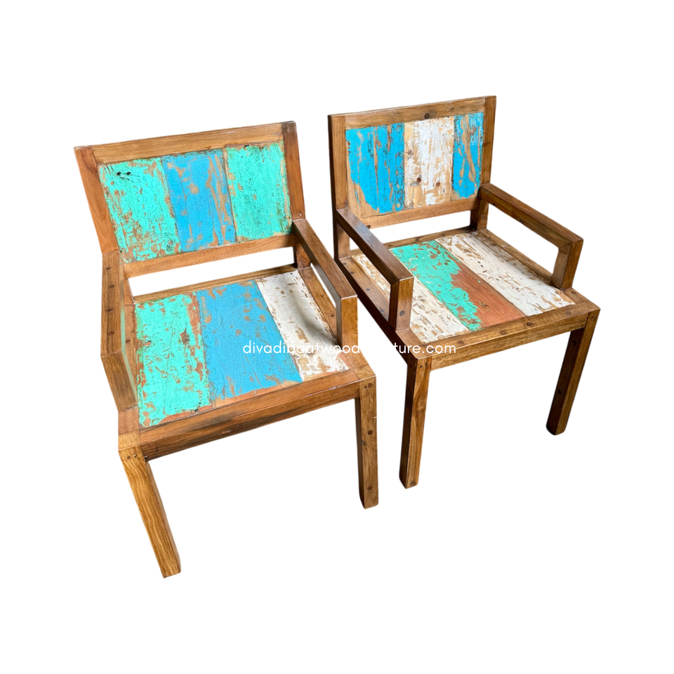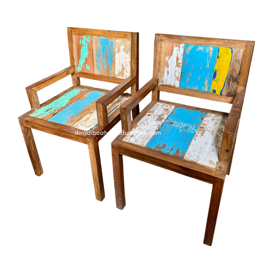 Silla de Comedor Rústica Resistente Hecha a Mano con Brazos de Madera de Barco Reciclada, Ecológica, Color Original Antiguo, para Interiores y Exteriores, Hotel y Hogar