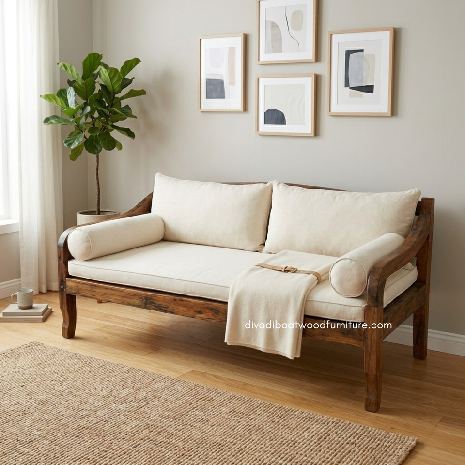 Sofá Cama Rústico Hecho a Mano con Cojín Incluido, Madera de Barco Reciclada Natural, Muebles Ecológicos para Sala de Estar, Interior y Exterior