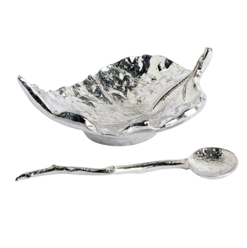 Accesorios de mesa de cocina con diseño de hoja acabada en plata hecha a mano, tazón de pimienta, servidor de bodega de sal, servidor y servidor de sal de Metal