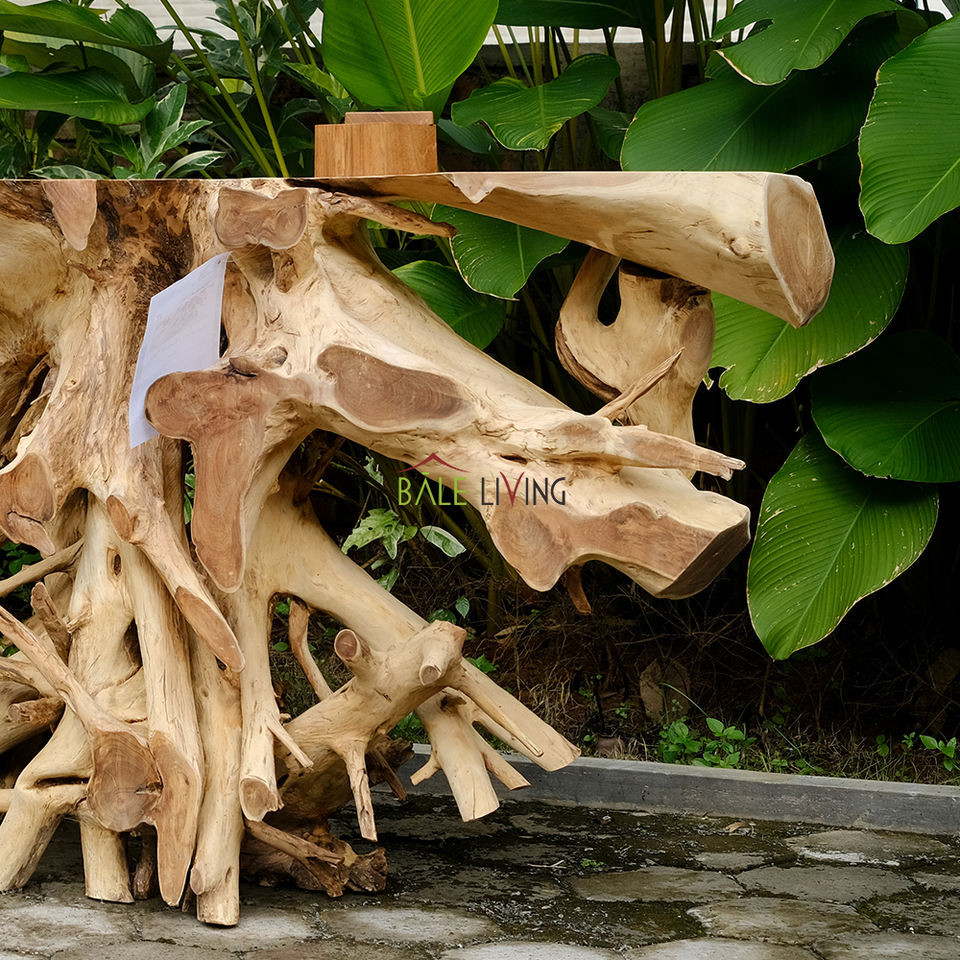 Mesa de centro de raíz de teca hecha a mano, un impresionante salón rústico con acento, muebles únicos con una mezcla de artesanía natural