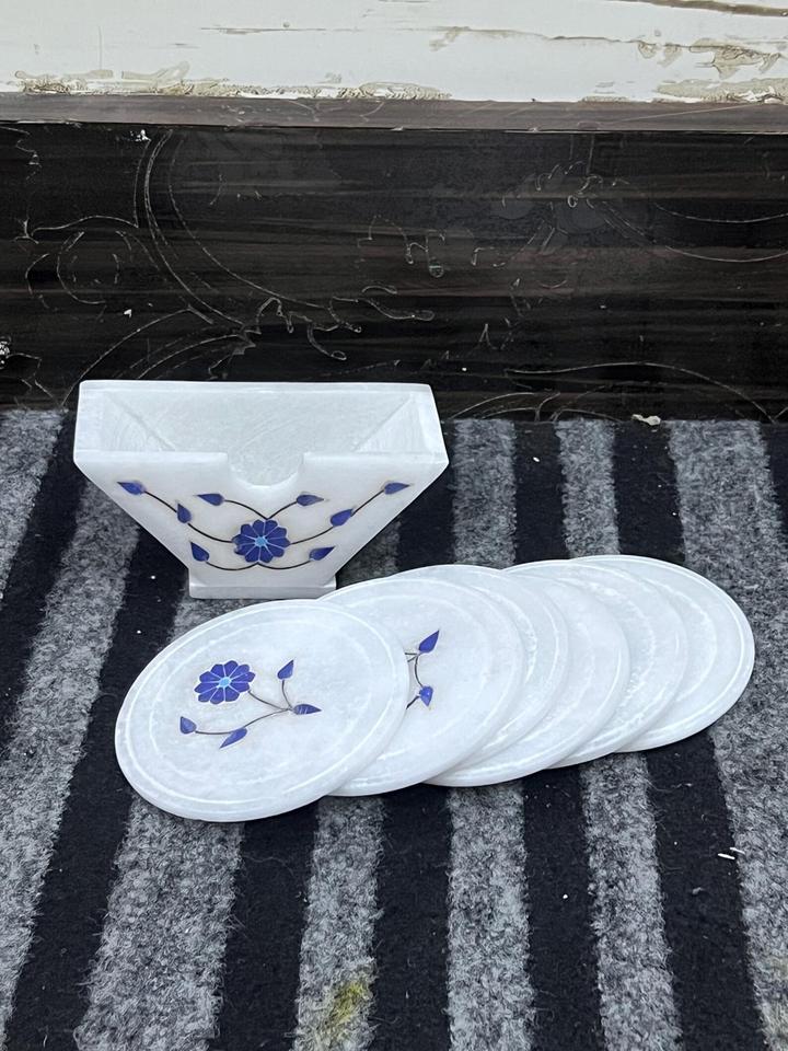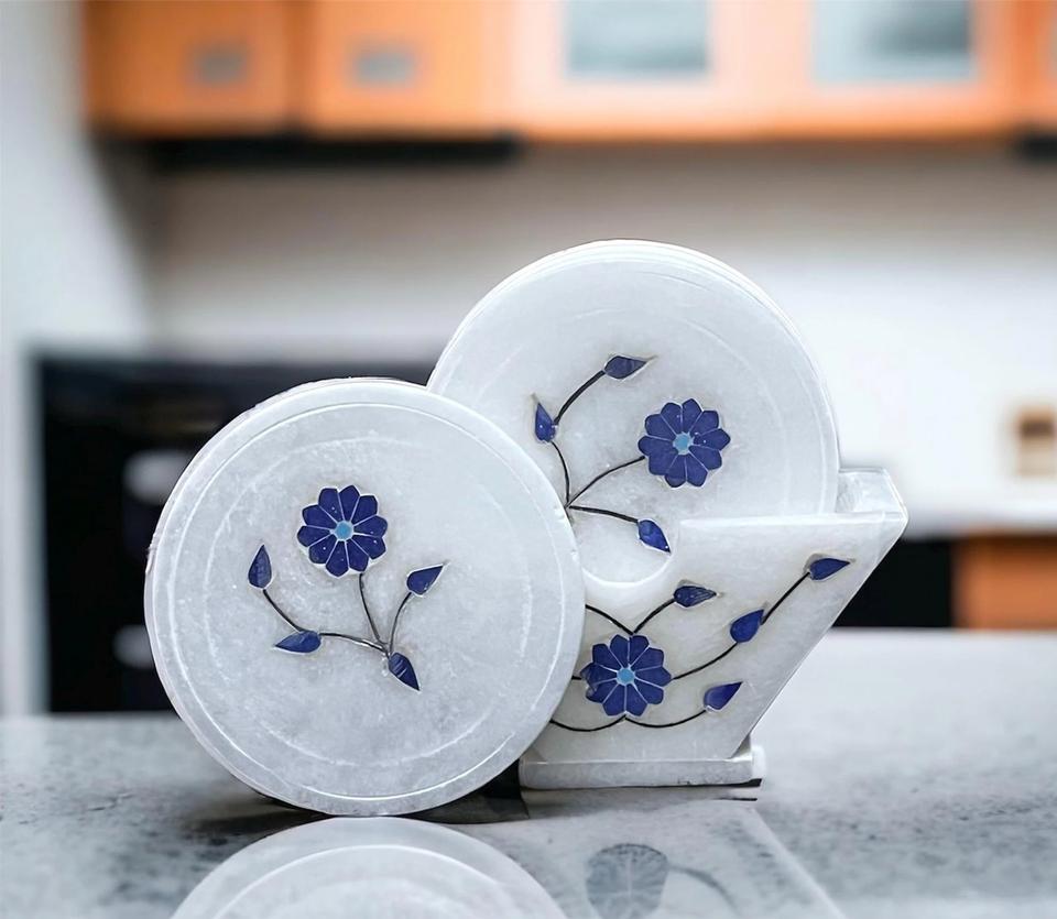 Juego de Posavasos de Mármol Blanco Hechos a Mano con Soporte, Posavasos Redondos de Mármol con Incrustaciones Florales Azules para Bebidas, Té y Café
