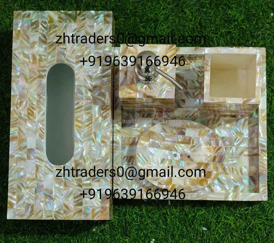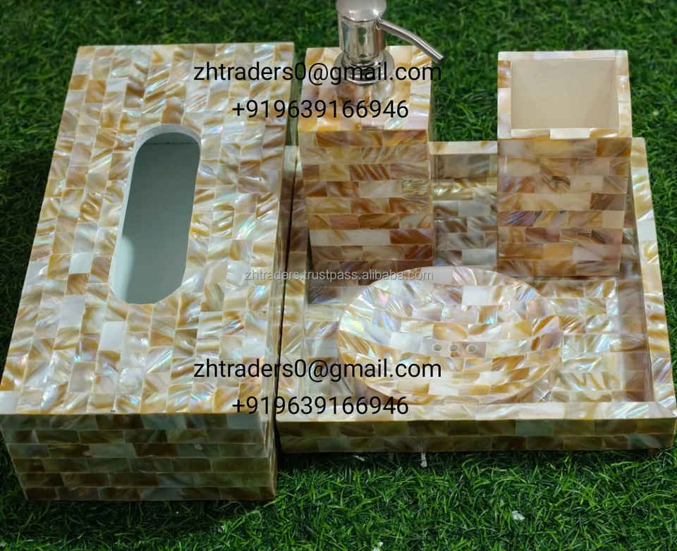 Juego de baño de 4 piezas con incrustaciones de perlas blancas hechas a mano, dispensador de jabón de lujo, vaso, soporte y colección de bandejas