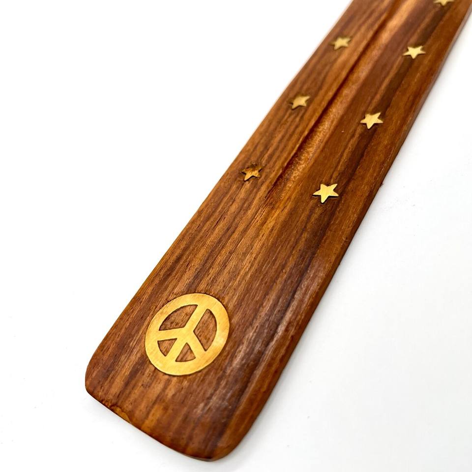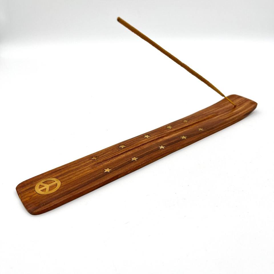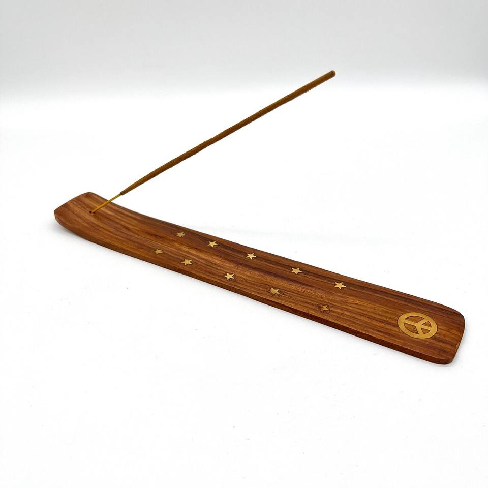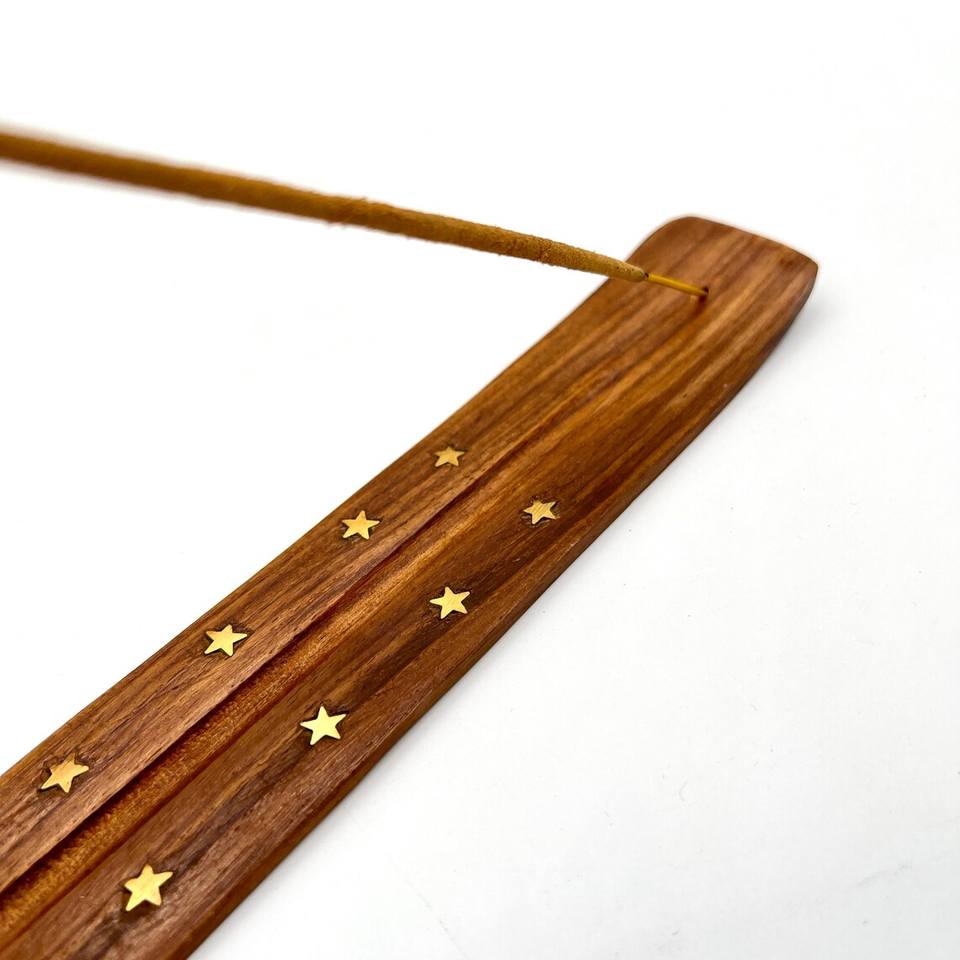 Soporte de incienso de madera hecho a mano con incrustaciones de latón, receptor de cenizas decorativo, símbolo de la paz, decoración del hogar, soporte de incienso de estrella de latón