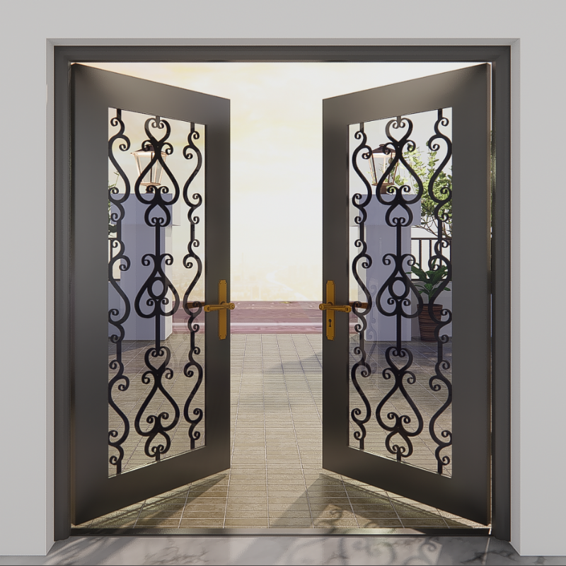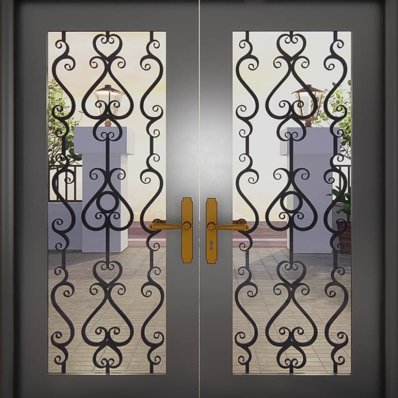 Puerta de entrada de hierro forjado artesanal con rollos de lujo y acabado mate para villas y propiedades de arquitectura clásica
