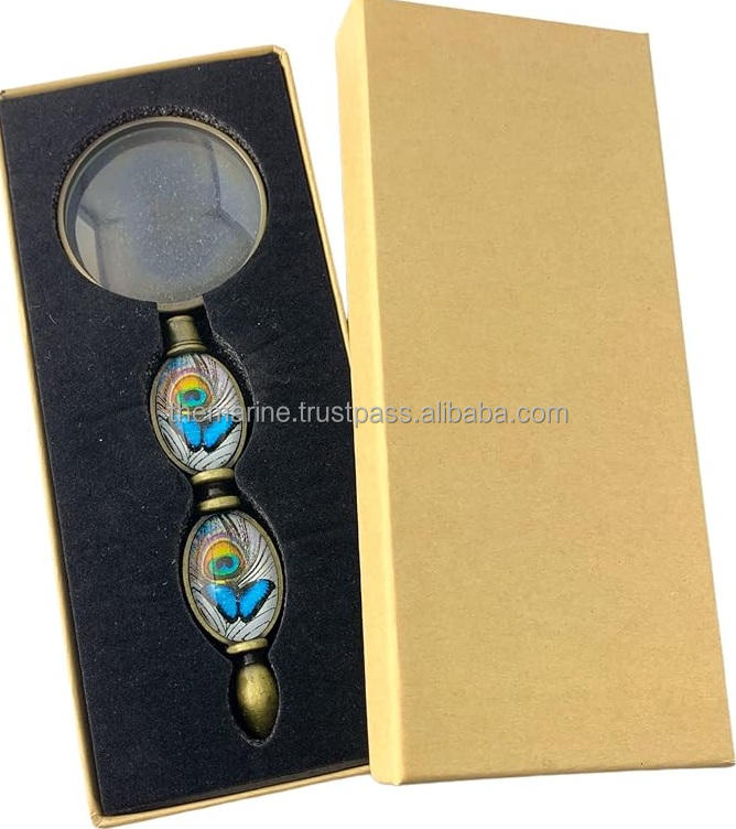Lupa de latón de forma redonda de mano con hermoso diseño de mariposa, lente de aumento de diseñador con mango de madreperla
