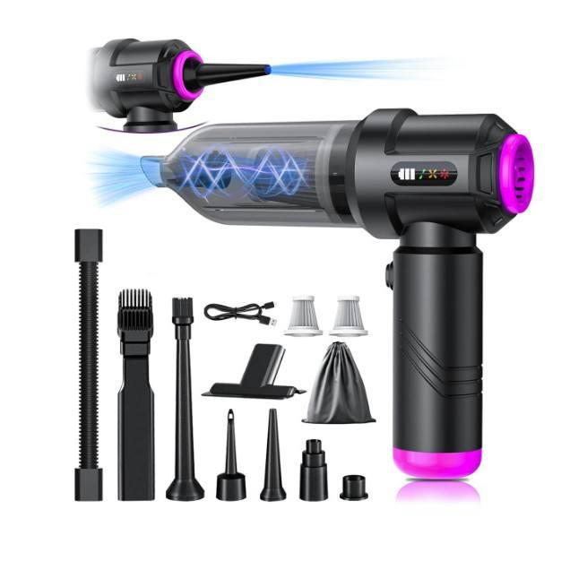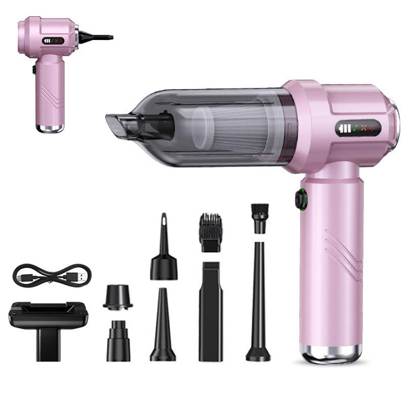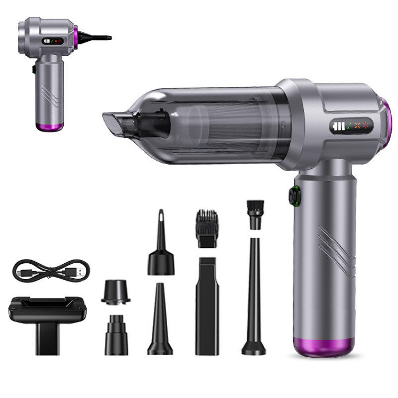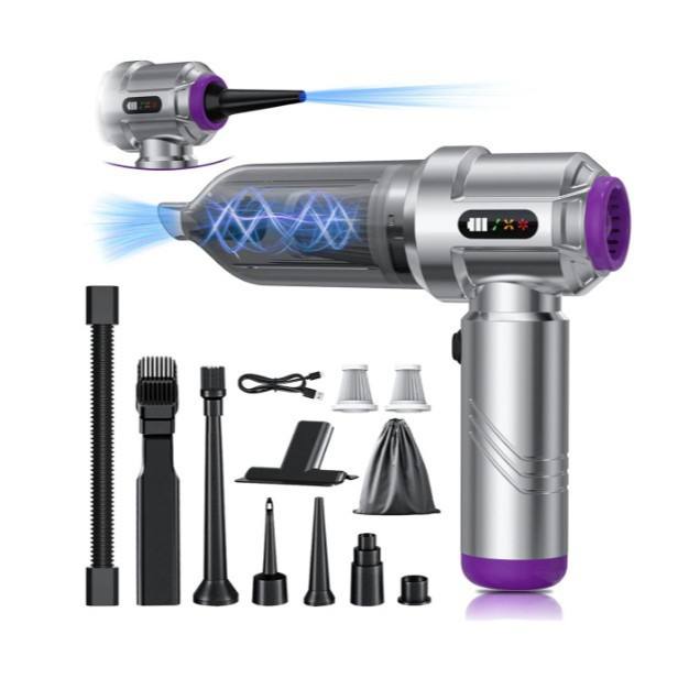 Aspiradora de mano recargable con batería, color plateado, con múltiples boquillas para uso en el coche y en el hogar.
