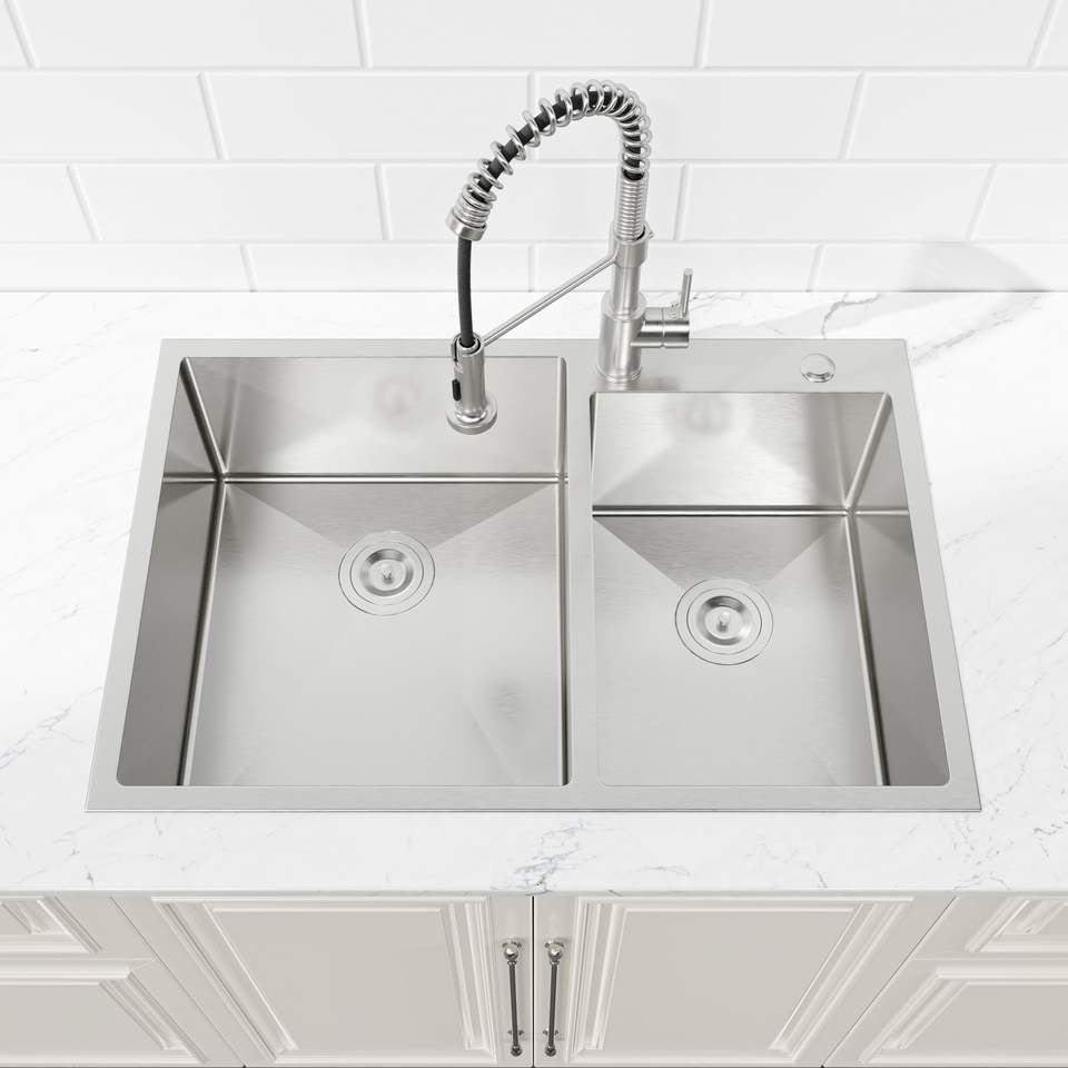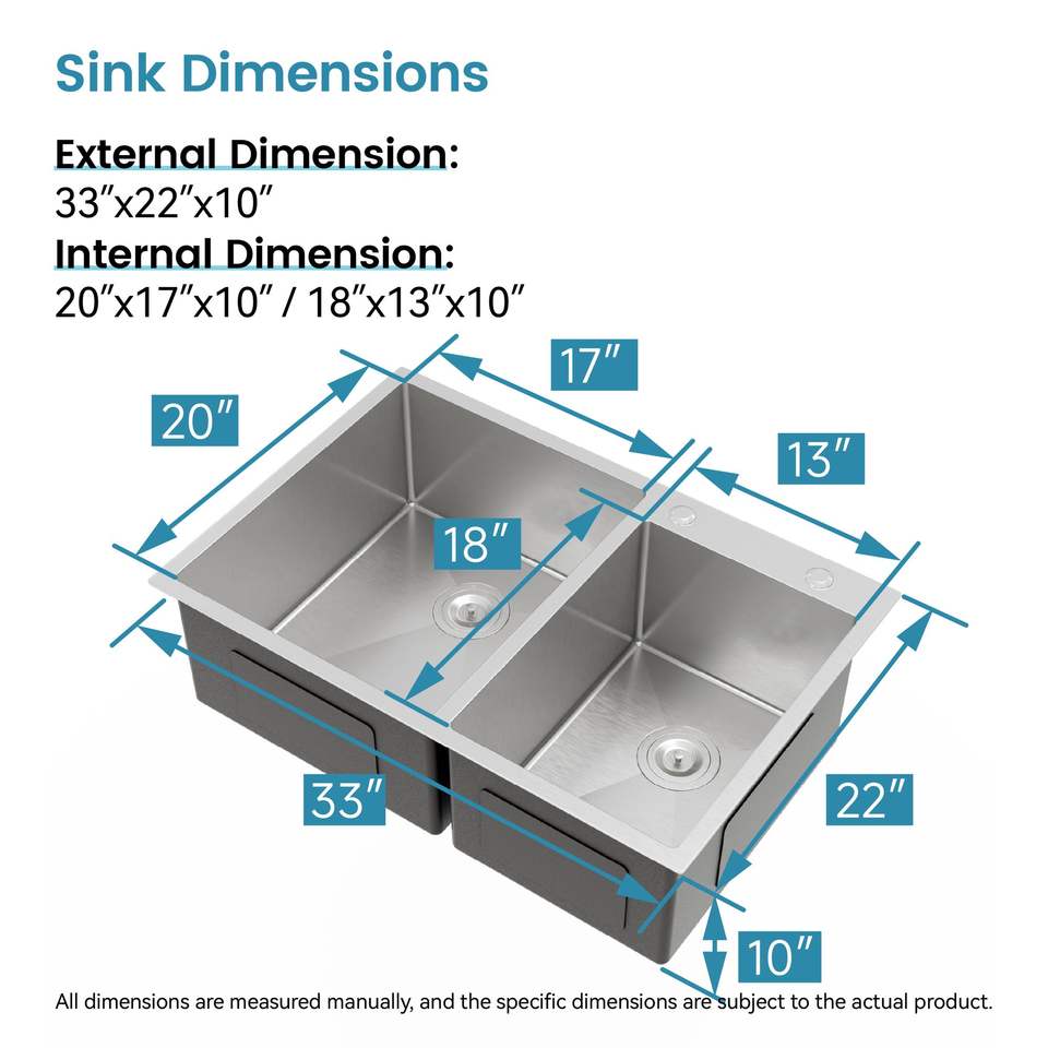 Fregadero de cocina empotrado de doble tazón hecho a mano de 33x19 pulgadas con acabado cepillado (solo fregadero) - No se puede enviar los fines de semana