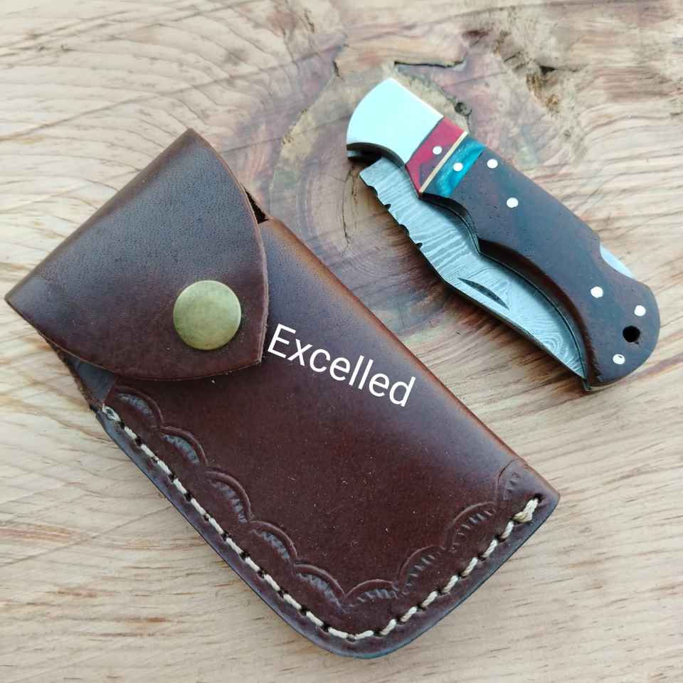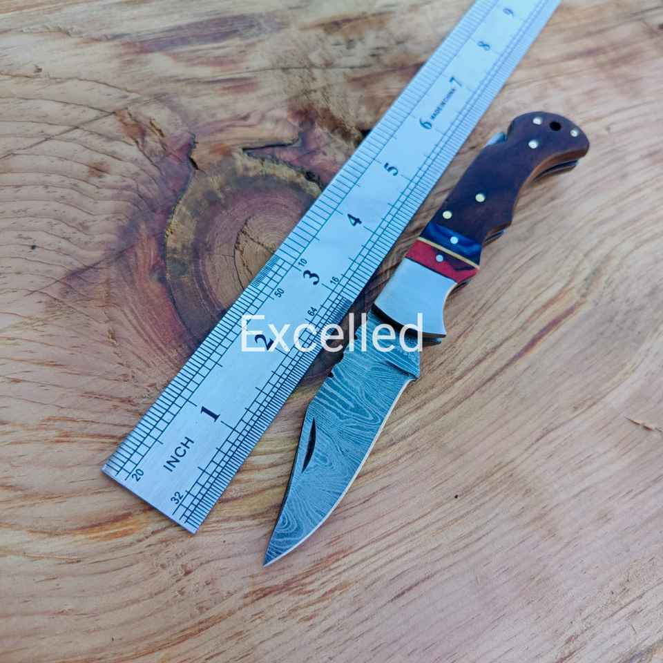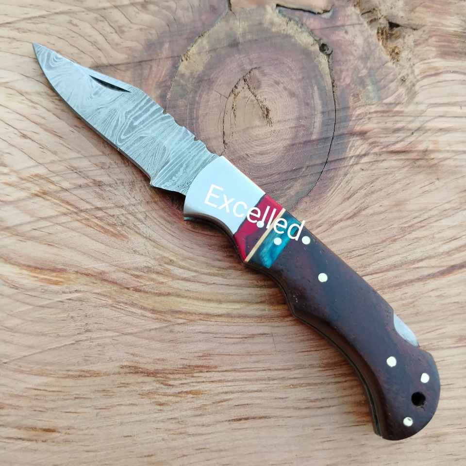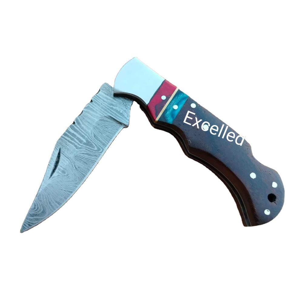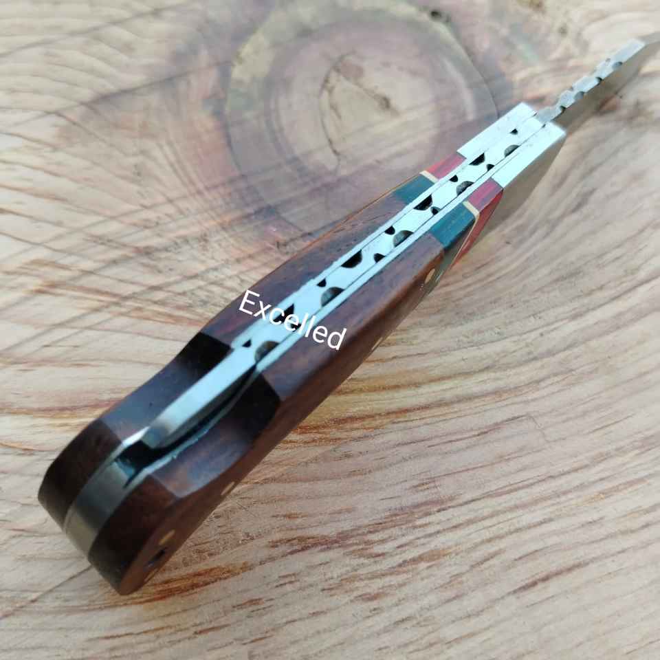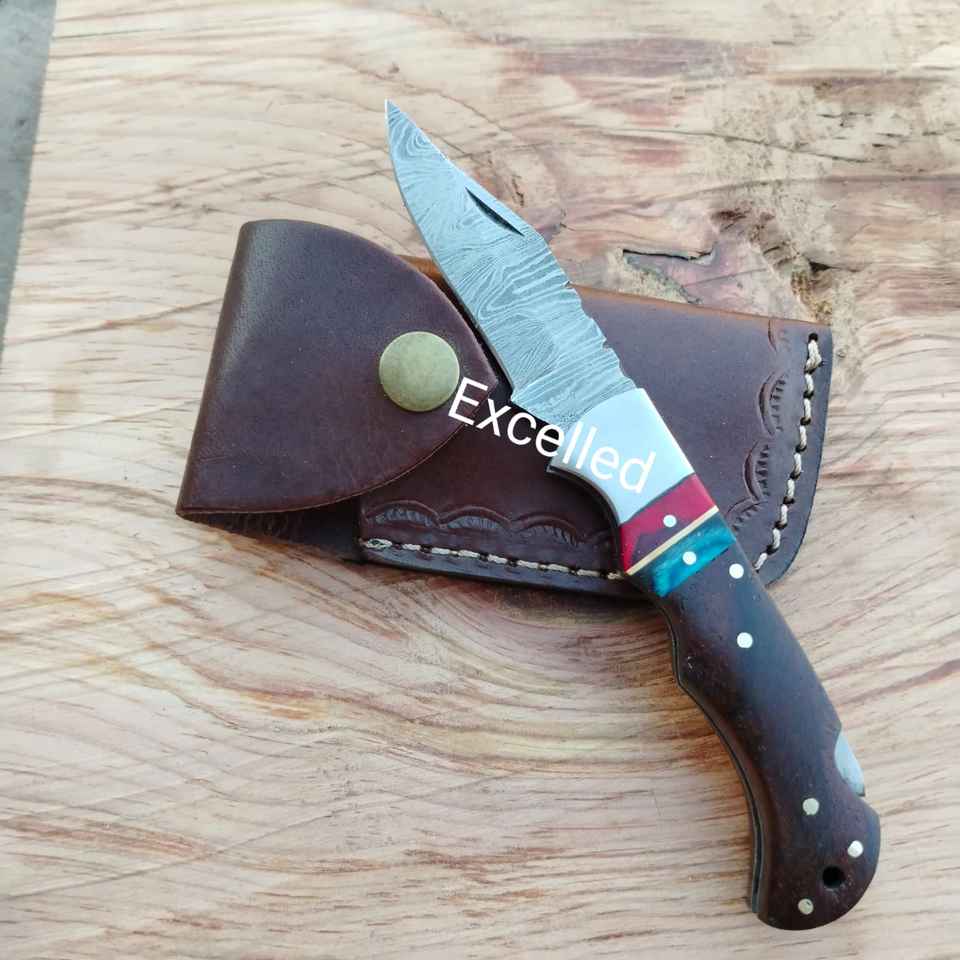 Cuchillo plegable multifuncional Damasco hecho a mano de 356 capas con mango de madera cuchillo de bolsillo con Cierre trasero viene con Funda de cuero