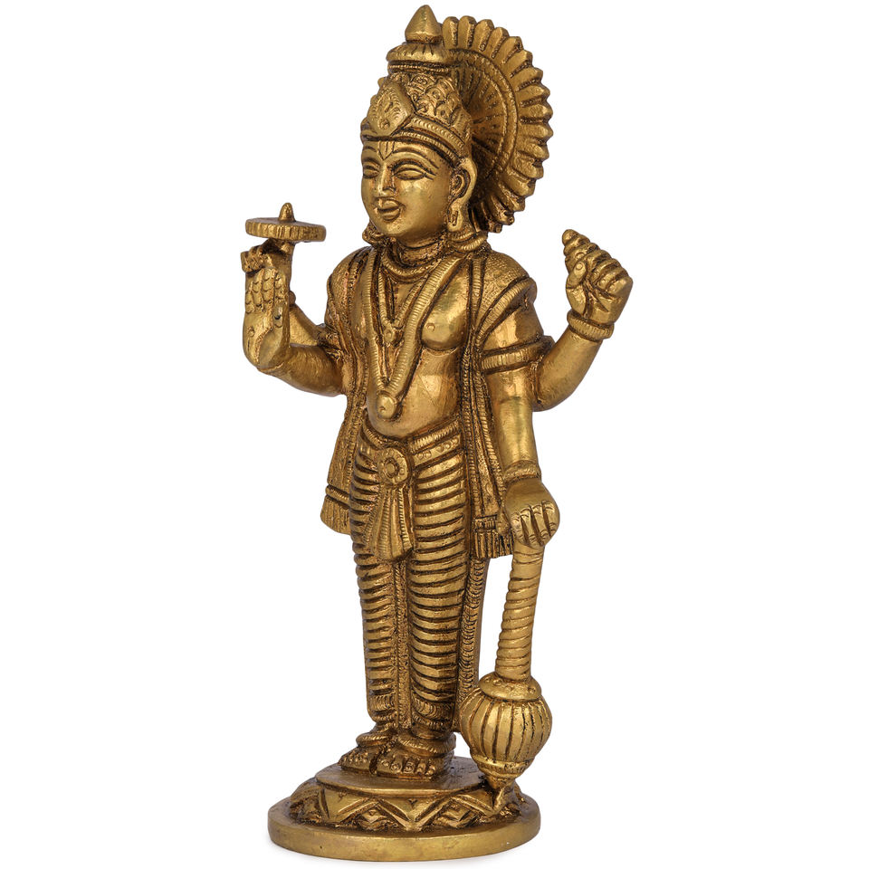 Estatua de Vishnu de cuatro brazos hecha a mano de 7 pulgadas escultura de latón de pie para regalar hecha en India