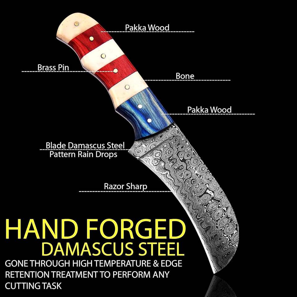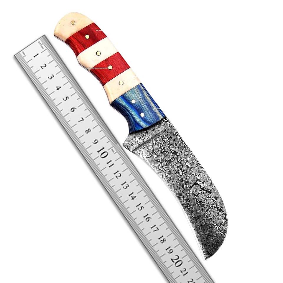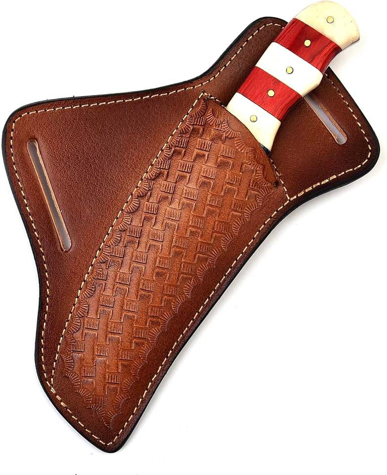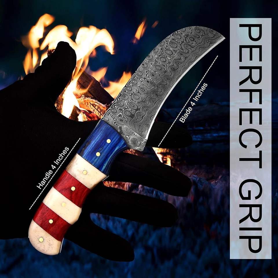 Cuchillo de Caza MORTAL SAGA Hecho a Mano de Acero de Damasco de 4.5 Pulgadas con Mango de Hueso Multicapa, Funda de Cuero Inoxidable, Personalizable OEM 1