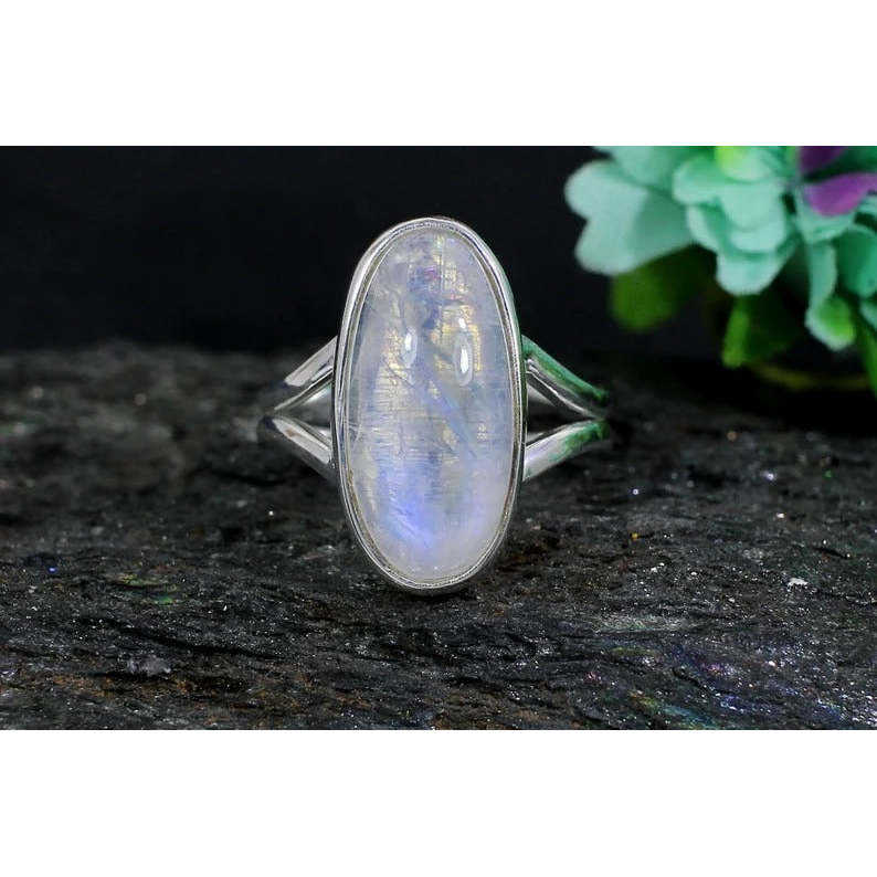 Anillo de plata 92,5 hecho a mano con piedra lunar arcoíris, joyería fina chapada en rodio, corte liso, 20x10mm, 6g
