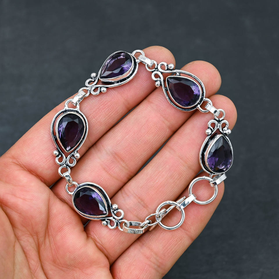 Pulsera de estilo de cadena chapada en plata 925 hecha a mano, amatista púrpura creada en laboratorio, diseño de piedras preciosas, regalo de joyería fina