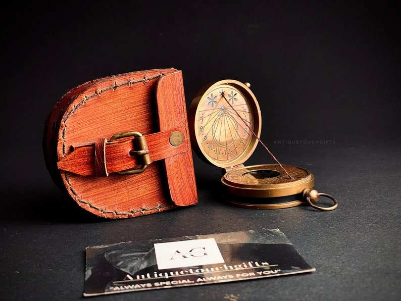 Brújula Náutica de Latón con Hilo de Estilo Antiguo Hecha a Mano con Estuche de Cuero, Brújula de Bolsillo con Reloj de Sol, Regalo para Él para el Día de la Independencia