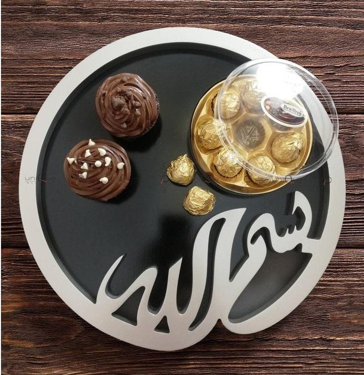 Bandeja Árabe de Madera Ecológica con Incrustaciones de Madreperla, Diseño Geométrico Artístico Hecho a Mano, Bandeja Decorativa de Estilo Oriental