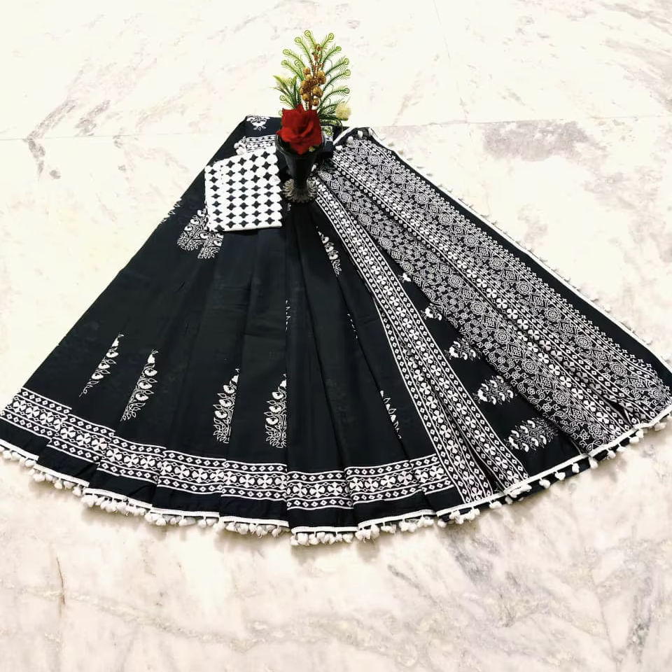 Sari de algodón mulmul estampado a mano con pompón, tela de alta calidad
