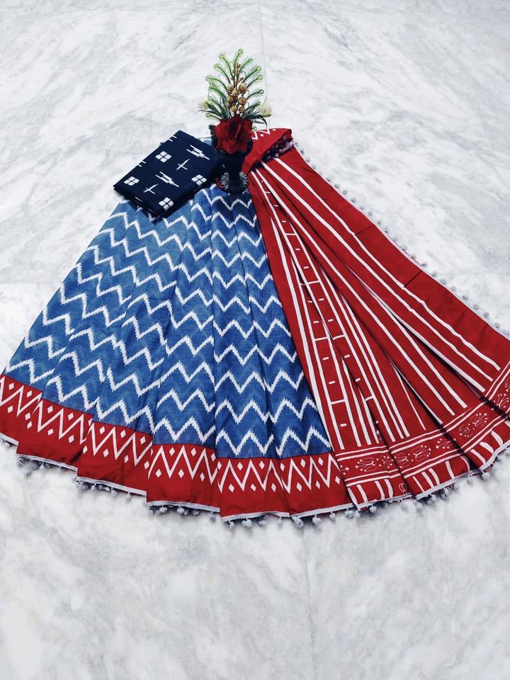 Sari de Algodón Mulmul Puro con Estampado Bagru Hecho a Mano, 5.5 Metros, 1 Metro de Tela para Blusa, Suelto y Natural | Encaje con borde de pompón indio