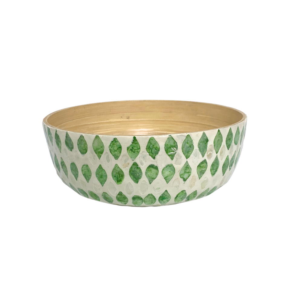 Cuenco decorativo con incrustaciones de Capiz de bambú hecho a mano, diseño ecológico redondo, patrón geométrico verde para servir la decoración de almacenamiento del hogar