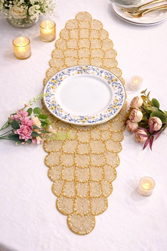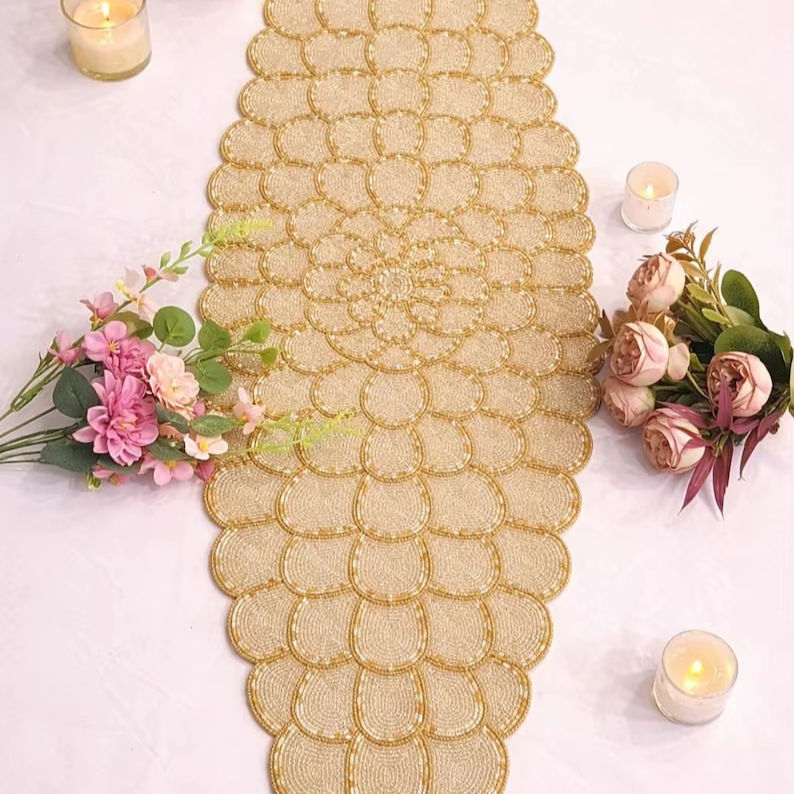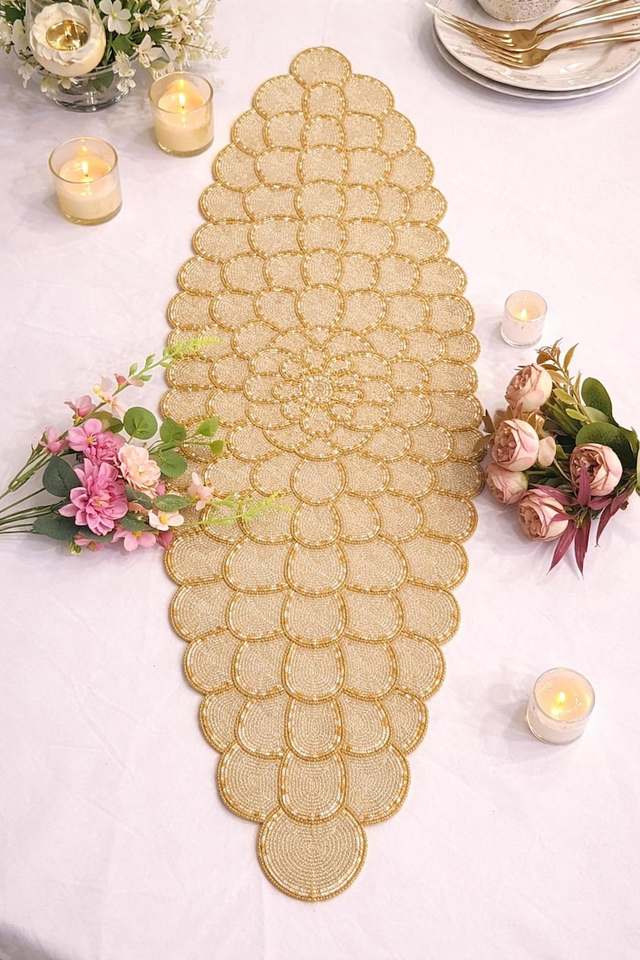Camino de Mesa Hecho a Mano con Cuentas, Floral Dorado y Marfil, 13x36 Pulgadas, Decoración para Bodas