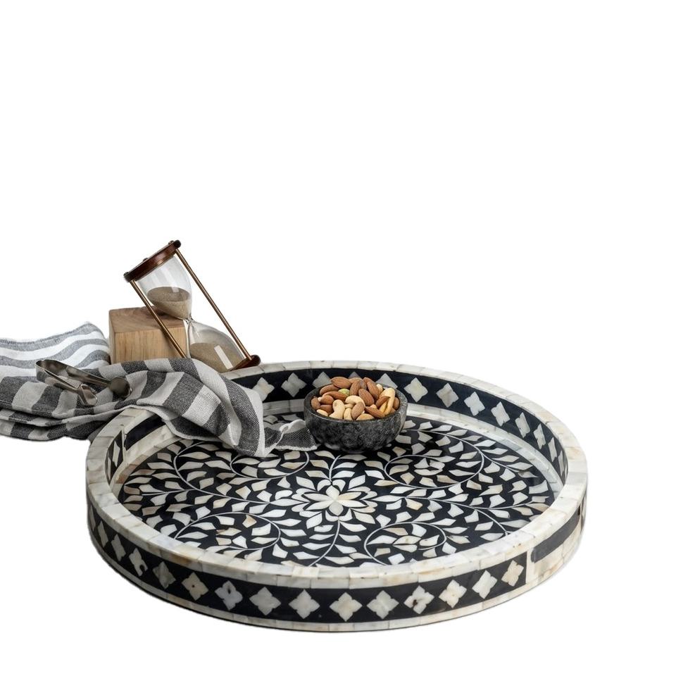 Bandeja Redonda Decorativa Hecha a Mano con Incrustaciones de Hueso Blanco y Negro, Bandeja de Servicio para Café, Decoración para Mesa, Bandeja para Servir Alimentos en Venta
