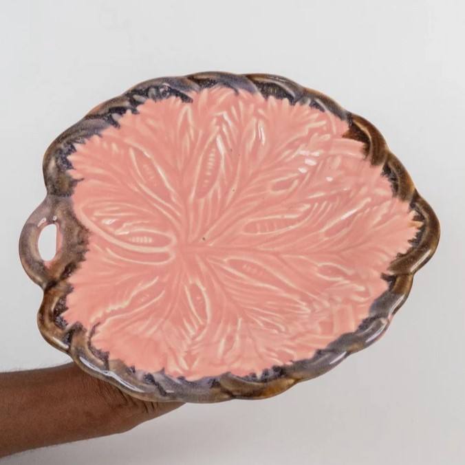 Plato de servir de cerámica negro hecho a mano con patrón de hojas en relieve, borde esculpido y asa lateral para una presentación elegante en la mesa.