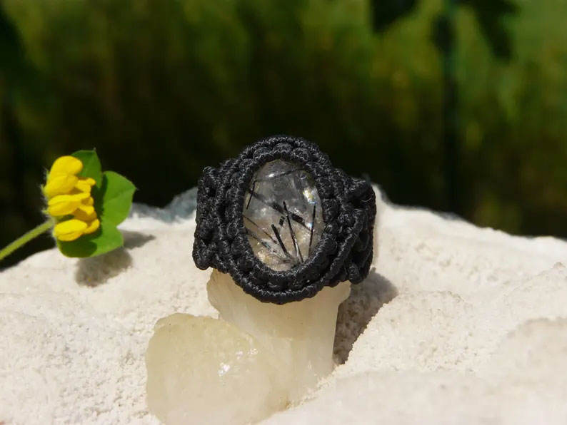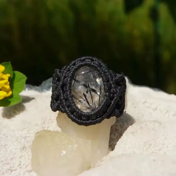 Anillo de Cuarzo Rutilado Negro Hecho a Mano con Macramé, Anillo Ajustable de Cristal Natural, Estilo Boho, Joyería Artesanal con Piedras Preciosas, Venta al Por Mayor