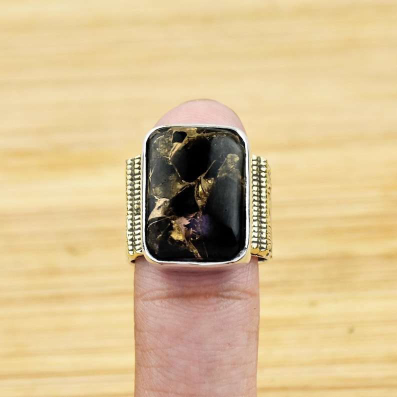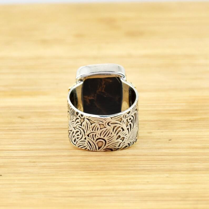 Anillo Turquesa Negro Hecho a Mano Plata de Ley Dos Tonos Banda Texturizada Tamaño Grande Boho Chic Joyería Regalo