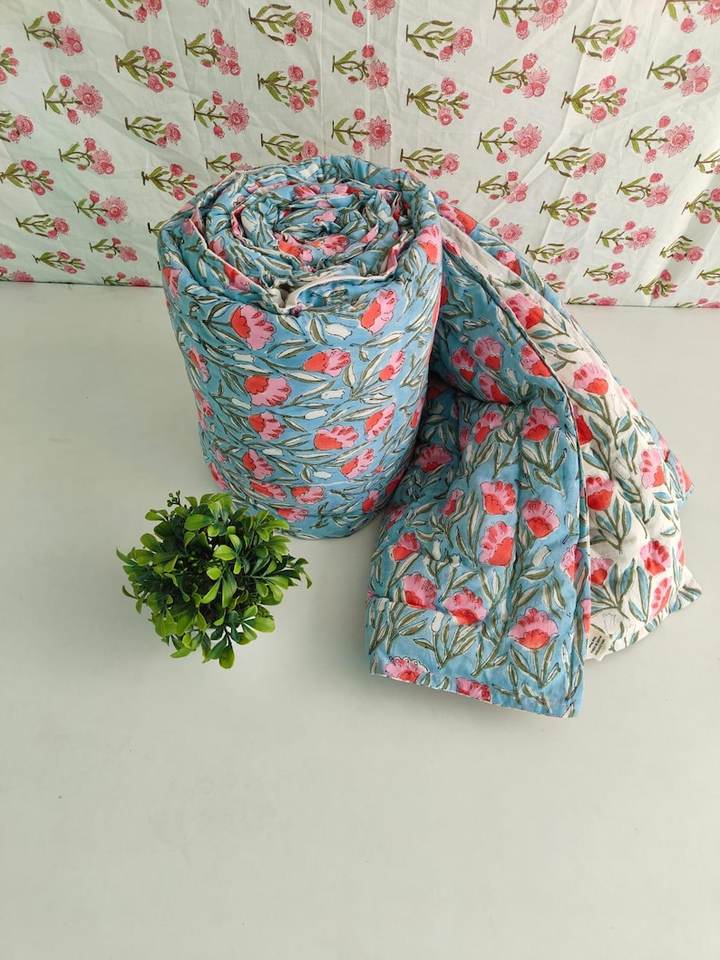 Colcha Razai Estampada a Mano, Cubrecama Acolchado, Ropa de Cama Acogedora, Regalo