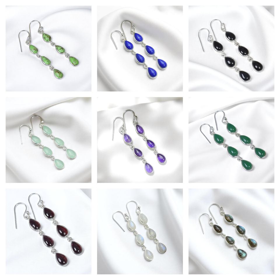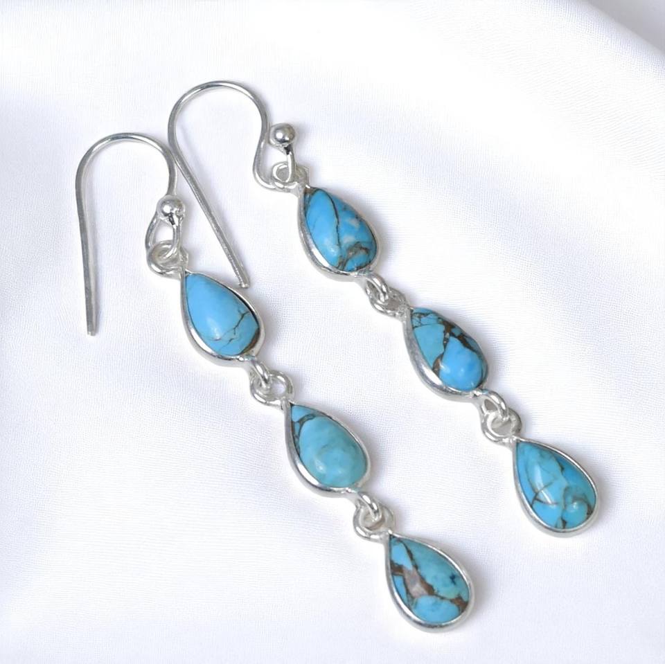 Pendientes Largos de Plata de Ley 925 con Turquesa Azul y Baño de Oro, Diseño de Pera, Hechos a Mano, para Mujer