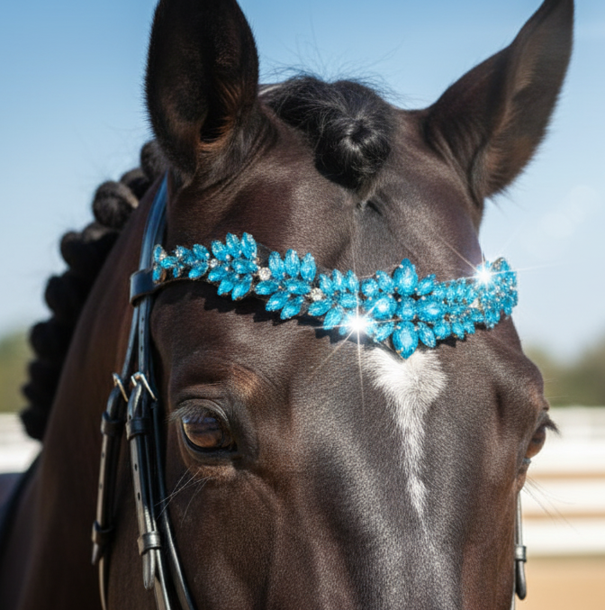 Banda de cejas de flor de cristal azul hecha a mano para caballos, tocado de brida ecuestre de diamantes de imitación de lujo para montar en doma