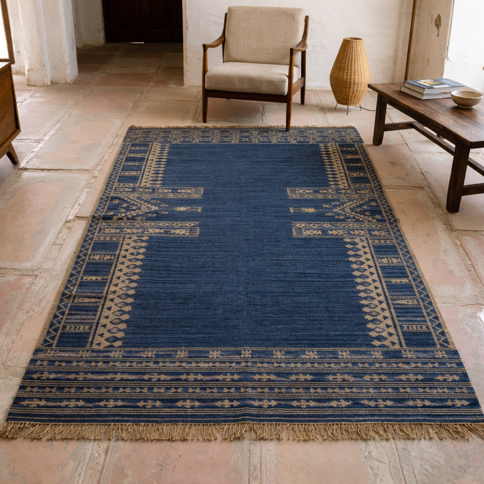 Alfombra Dhurrie Kilim Azul Hecha a Mano - Moderna, Abstracta, de Tejido Plano, Acolchada, Antideslizante y Lavable para el Hogar y Viajes