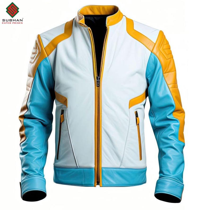 Chaqueta de Motociclista Casual de Invierno, Hecha a Mano, en Cuero Sintético Azul y Blanco, con Cierre, Cuello Mao, Servicio OEM, Personalizable