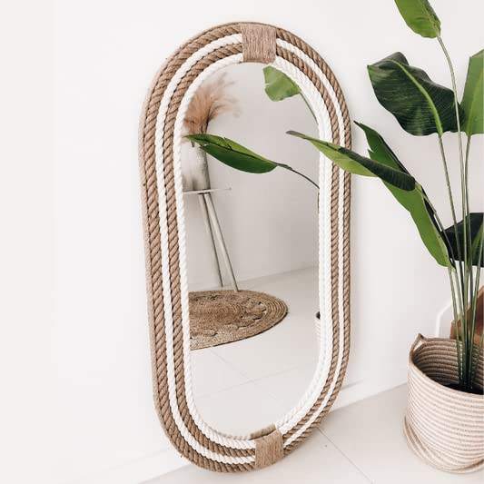 Espejo Bohemio Hecho a Mano con Marco de Madera Náutica y Cuerda Gruesa, con Cristal, para Cuarto Infantil Estilo Boho