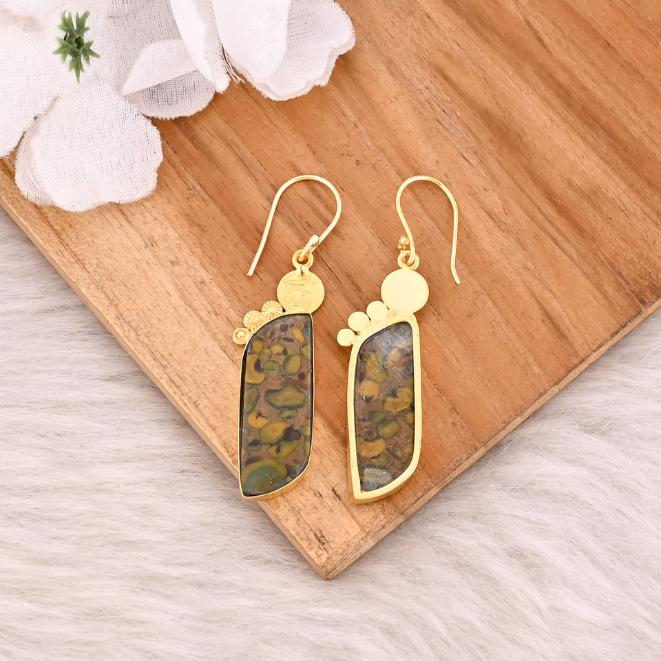 Pendientes Clásicos de Latón Chapado en Oro Amarillo con Jaspe Frutal, Estilo Moderno, Pendientes de Latón para Bodas, Fiestas, Regalo Elegante para Mujer