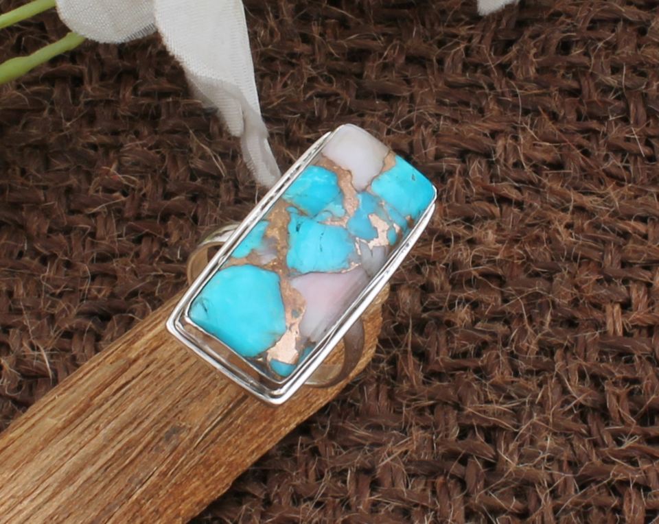 Anillo de Boda de Plata Estilo Boho Vintage Hecho a Mano para Mujer, con Piedra Preciosa de Turquesa Rosa y Cobre, Engaste de Bisel, Forma Rectangular, para Fiesta