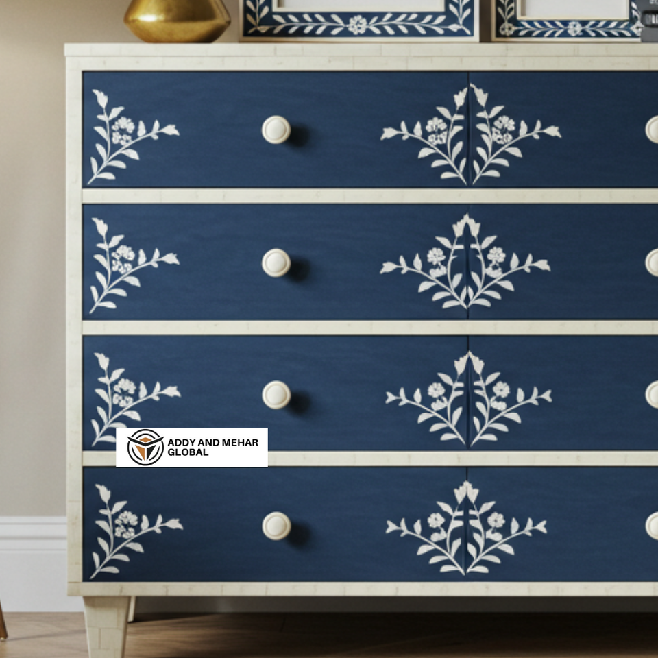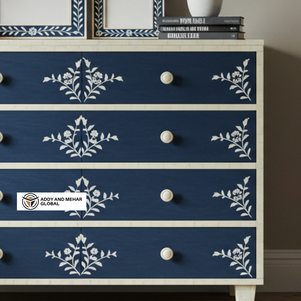 Cómoda Moderna Ecológica de Madera Maciza de Mango con Incrustaciones de Hueso Hecha a Mano, con 6 Cajones, Color Azul