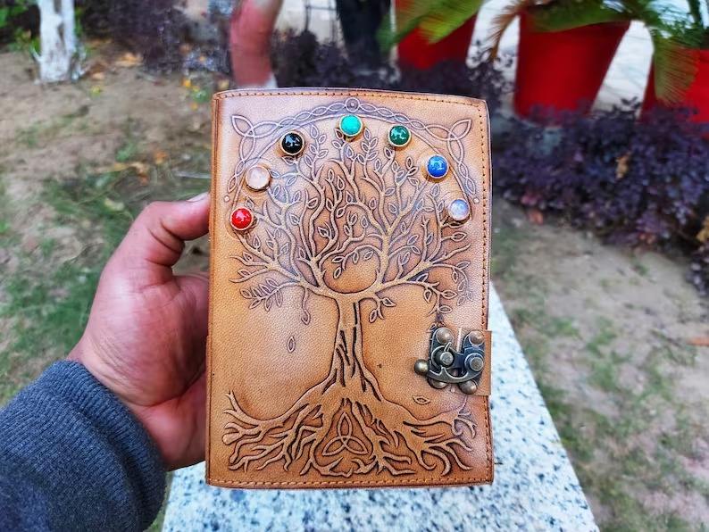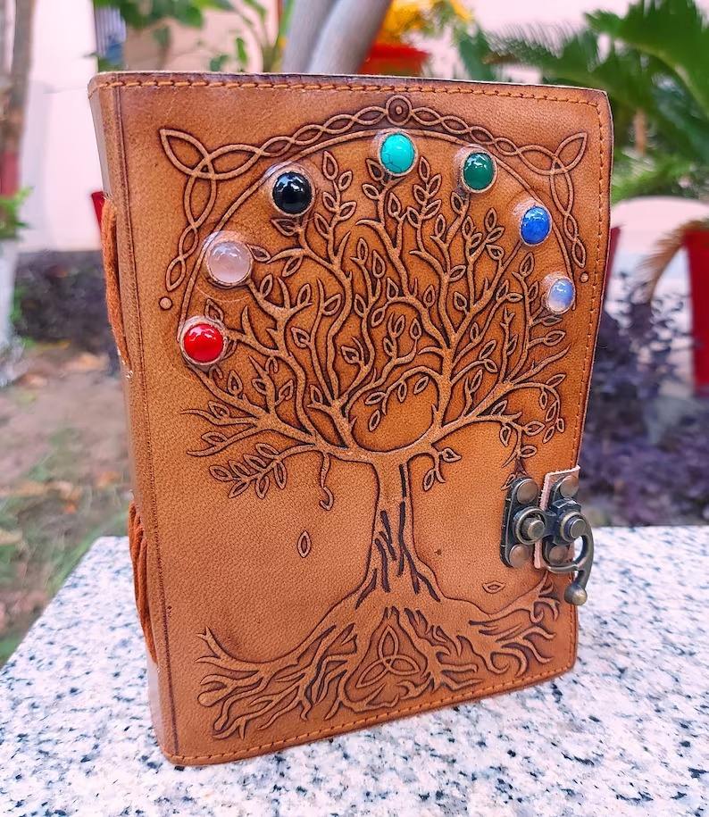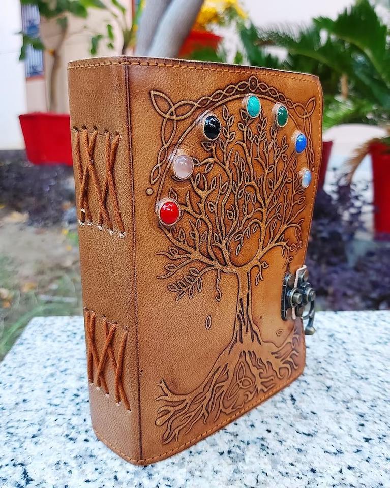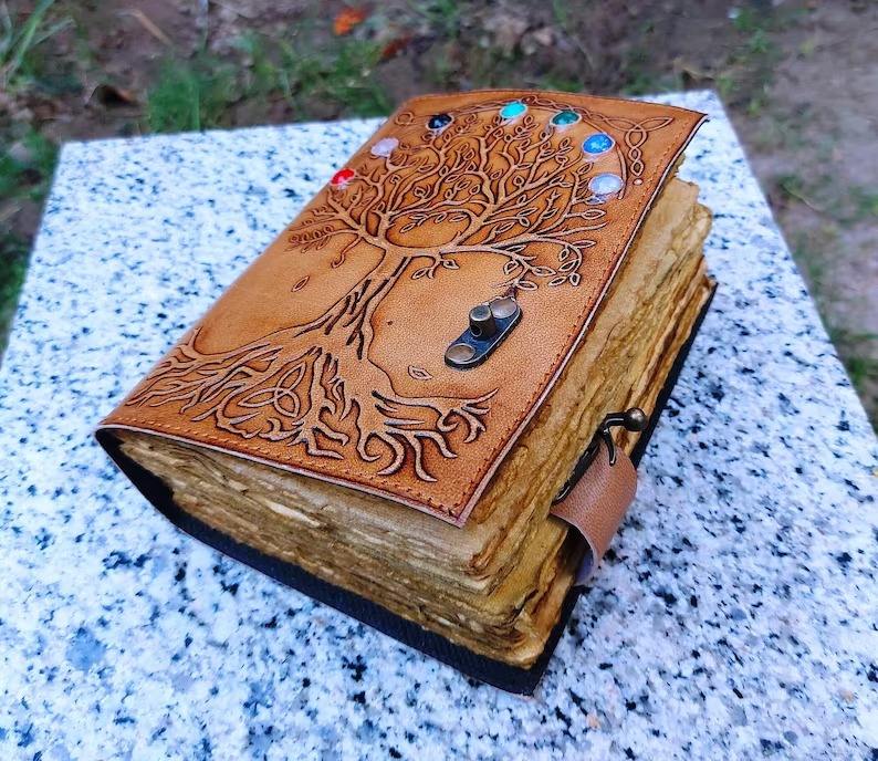 Hecho a mano bronce-Color A3 tamaño árbol vida cuero Grimoire Vintage mejor regalo para él sus siete piedras Deckle Edge diario caja embalada