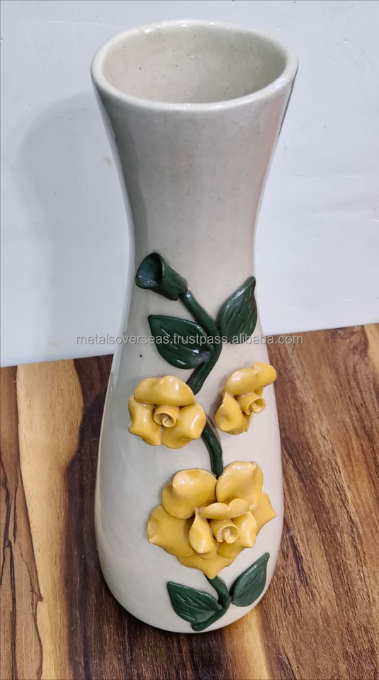 Jarrón de cerámica hecho a mano con decoración de rosa de bronce 3D, elegante jarrón de cerámica crema con detalles florales para decoración del hogar
