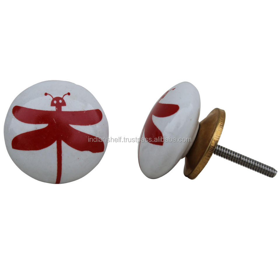 Perillas de cerámica hechas a mano al por mayor, perilla de armario redonda blanca de libélula roja, tiradores de puerta, Fabricante de herrajes, tiradores de cajón, lote a granel