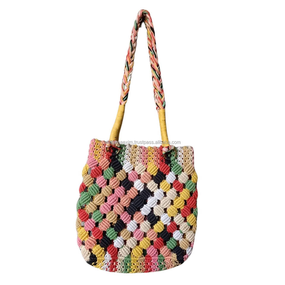 Bolso de mano de macramé colorido hecho a mano con cuentas Bolsa de compras de macramé de calidad premium con mango de madera de proveedor indio
