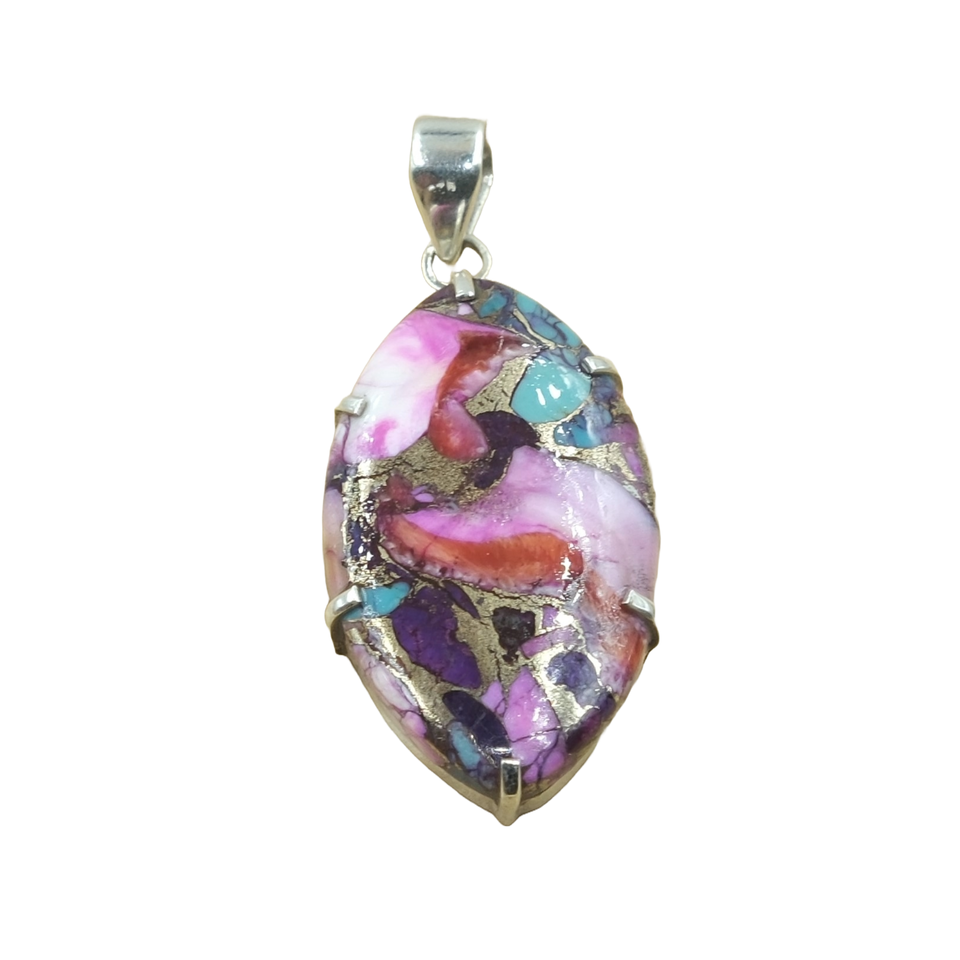 Colgante de Cobre Hecho a Mano con Turquesa, Gemas Rosas, Azules y Rojas, Colgante de Plata 925, Joyería de Diseño, Incrustaciones de Mosaico Marquise