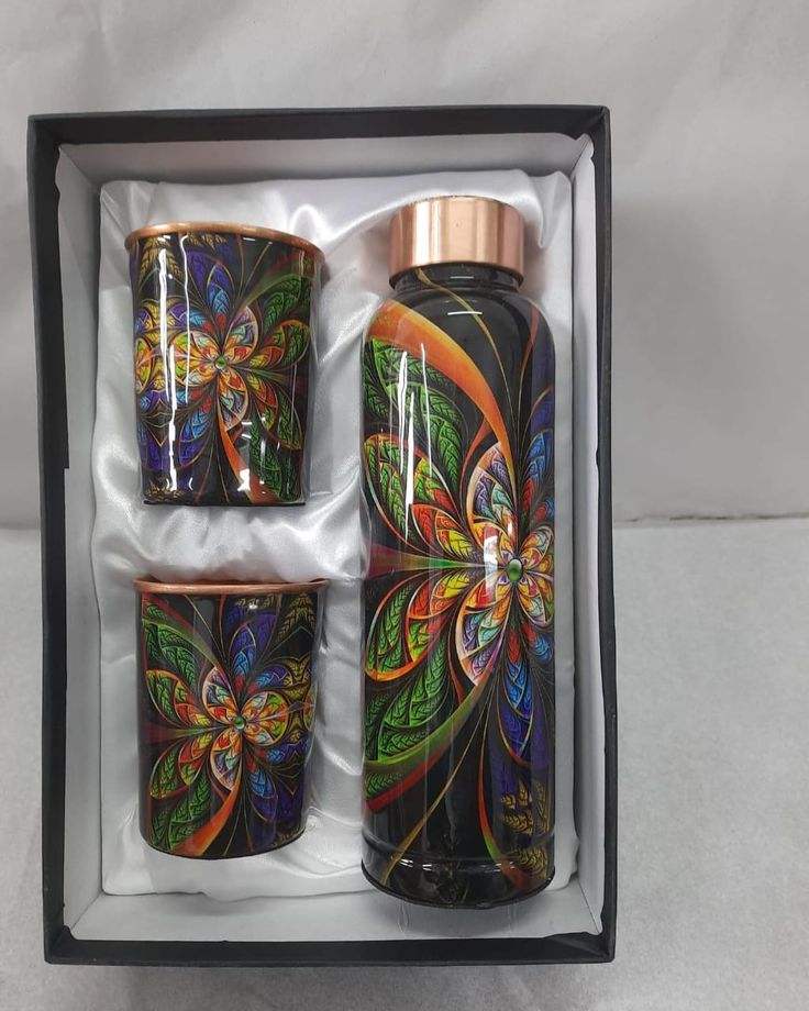 Botella de agua de cobre hecha a mano con juego de dos vasos, estampado floral, artículos de metal para bebidas, caja de regalo para bienestar, hidratación ayurvédica.