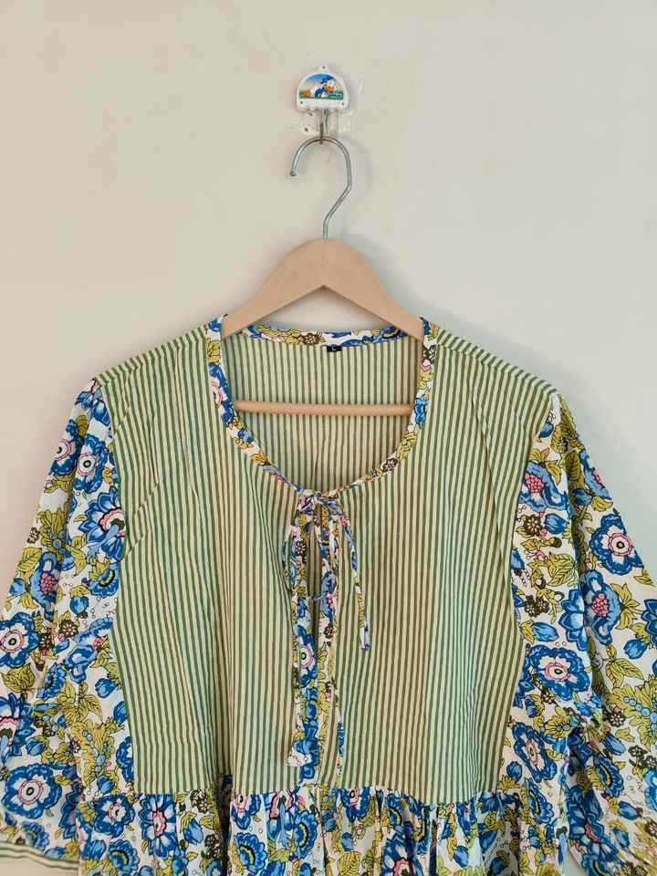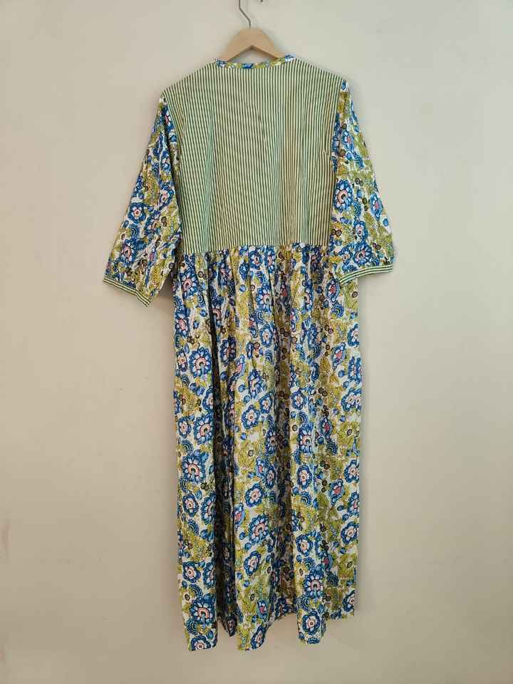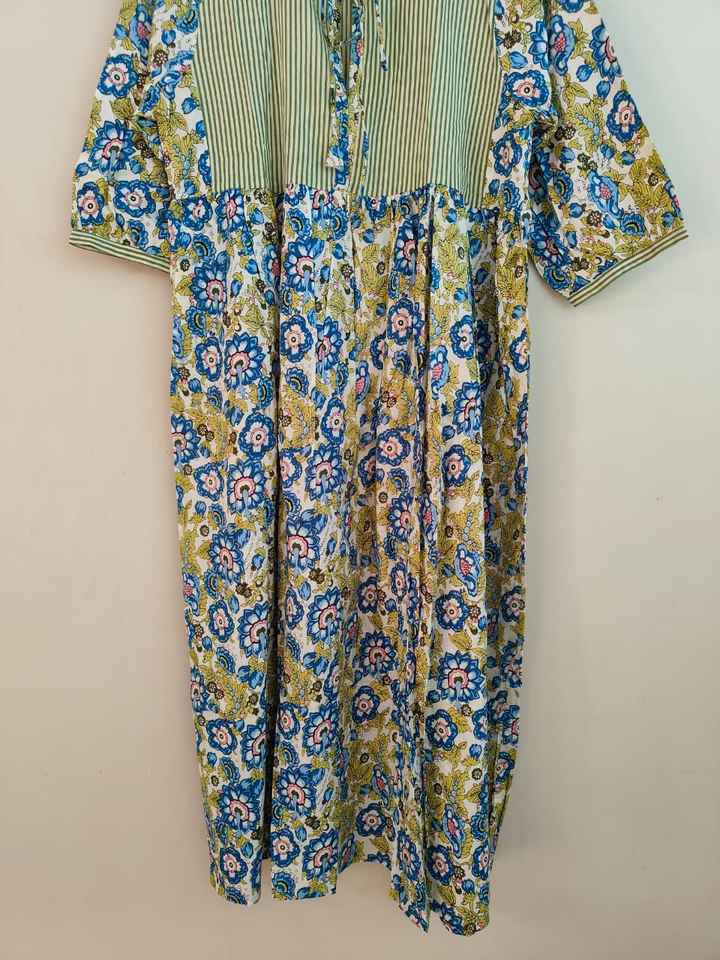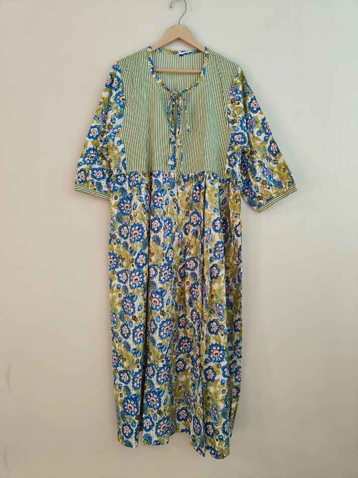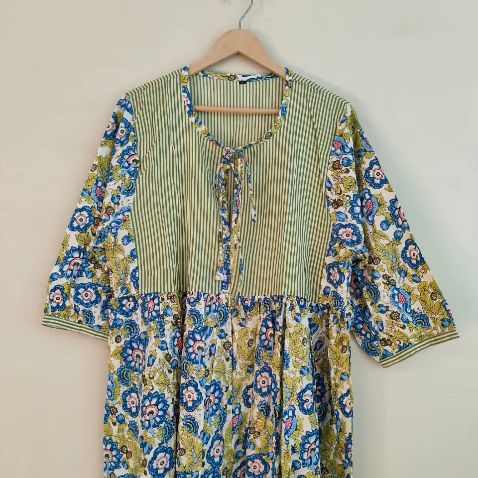Vestido Maxi Boho Hecho a Mano con Estampado Floral en Bloques de Algodón, Cuello en V, Manga Larga, Largo hasta el Suelo, con Yoke a Rayas | Cómodo Caftán de Verano